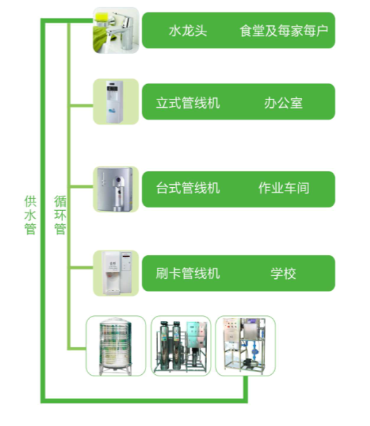 方便:循環(huán)管網(wǎng)直接輸送至各個(gè)終端,現(xiàn)制現(xiàn)飲,24小時(shí)冷熱水供應(yīng);